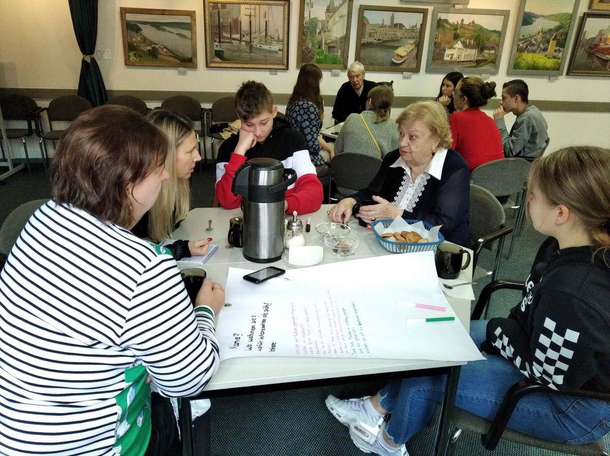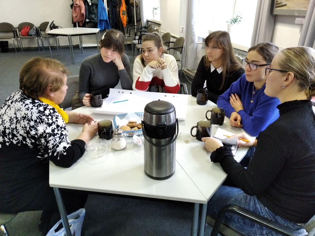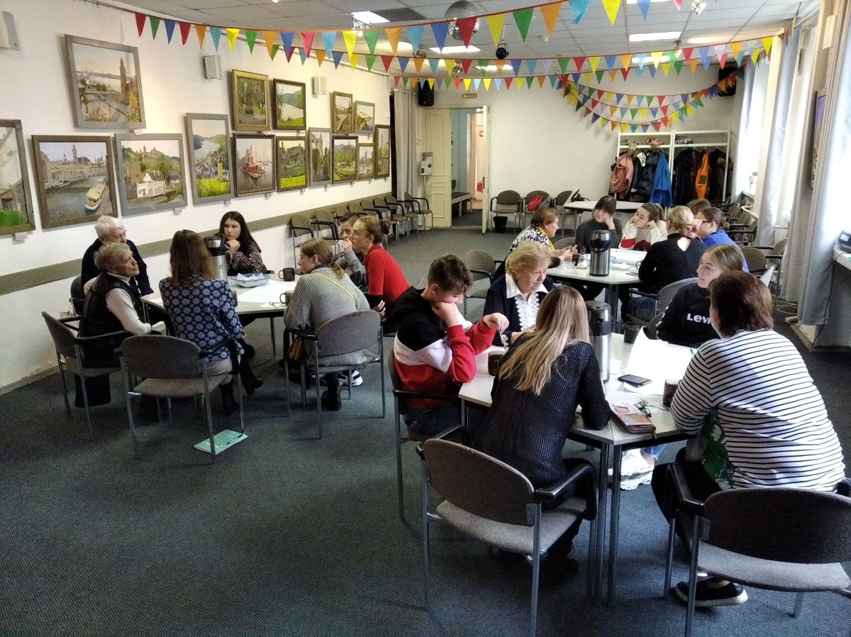 Für die Unterhaltung mit noch lebenden Augenzeugen der Blockade waren im Programm zwei Stunden vorgesehen, die über anregenden Gesprächen und Tee mit Piroggen wie im Flug vergingen. Die Dolmetscher/-innen, die im September unsere Vorbereitungskurse besucht haben, halfen bei der Kommunikation und lenkten den Dialog geschickt durch alle aufkommenden Schwierigkeiten.