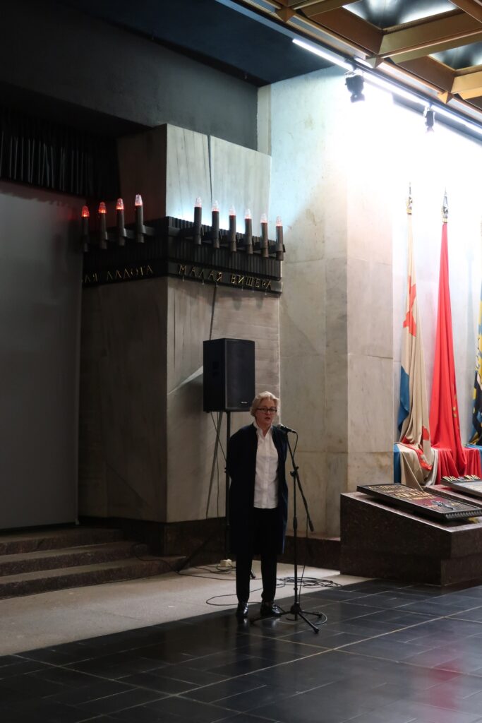 Am 11. November wurde die Ausstellung an ihrem vierten Veranstaltungsort eröffnet: dem Monument für die heldenhaften Verteidiger Leningrads. Die Gäste – darunter Blockadeüberlebende, Mitglieder von Petersburger Seniorenverbänden und andere Interessierte – wurden zunächst im unterirdischen Gedenksaal von Jewgenija Igorewna Kulikowa, der Leiterin der Museumsfiliale, und drb-Direktorin Arina Nemkowa begrüßt. Anschließend führte Milena Tretjakowa, stellv. Leiterin der ANO „Erinnerungskultur“ und einer der Kuratorinnen des Projekts, durch die Ausstellung. Dabei wies sie mehrfach auf die Besonderheit des Projekts hin: Die Ausstellungmacher/-innen verwenden nicht nur bislang unveröffentlichte Archivmaterialien, sondern erzählen zudem die Geschichte der Kinder sowohl während der Zeit der Evakuierung als auch nach dem Ende der Blockade.