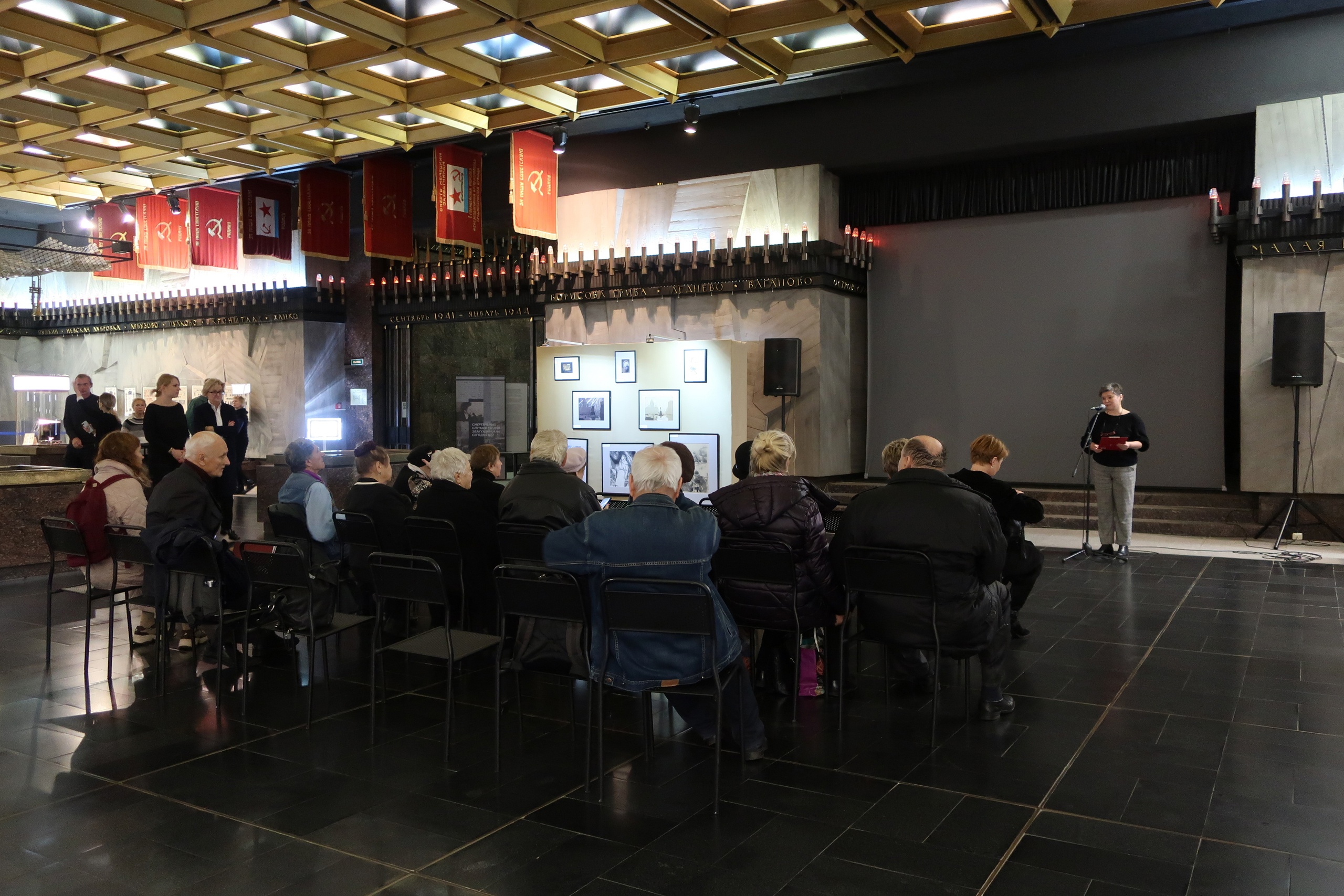 Am 11. November wurde die Ausstellung an ihrem vierten Veranstaltungsort eröffnet: dem Monument für die heldenhaften Verteidiger Leningrads. Die Gäste – darunter Blockadeüberlebende, Mitglieder von Petersburger Seniorenverbänden und andere Interessierte – wurden zunächst im unterirdischen Gedenksaal von Jewgenija Igorewna Kulikowa, der Leiterin der Museumsfiliale, und drb-Direktorin Arina Nemkowa begrüßt. Anschließend führte Milena Tretjakowa, stellv. Leiterin der ANO „Erinnerungskultur“ und einer der Kuratorinnen des Projekts, durch die Ausstellung. Dabei wies sie mehrfach auf die Besonderheit des Projekts hin: Die Ausstellungmacher/-innen verwenden nicht nur bislang unveröffentlichte Archivmaterialien, sondern erzählen zudem die Geschichte der Kinder sowohl während der Zeit der Evakuierung als auch nach dem Ende der Blockade.