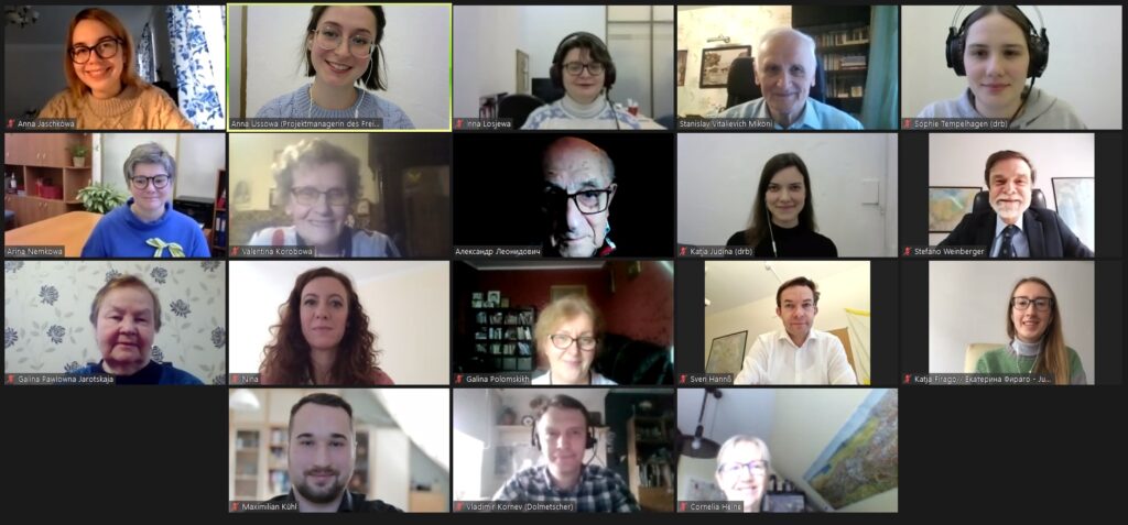 Schon seit längerer Zeit gilt es als akzeptabel, Diskussionen und Runde Tische – auch unter Beteiligung wichtiger Akteure – per Videokonferenz abzuhalten. So fand am 29. Januar auch unser Gespräch, das dem 77. Jahrestag der Befreiung Leningrads von der Blockade gewidmet war, im Online-Format statt.