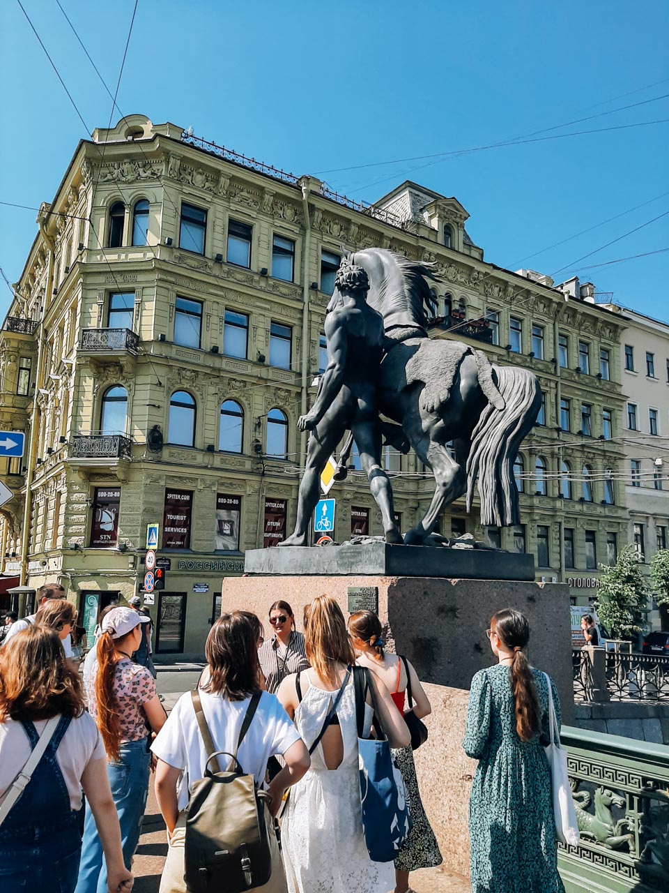 Unser Tag begann mit kommunikativen Spielen im Katharinengarten. Anschließend erwartete die Alumni eine Exkursion mit dem Titel “Blockade ohne Parade”, die auf Tagebucheinträgen von Einwohner/-innen der belagerten Stadt basierte. Diese Bezeichnung beruhte auf der unkonventionellen Herangehensweise der Stadtführerin, die ihren Schwerpunkt auf die weniger bekannten Seiten der Blockadegeschichte legte, wie etwa auf Einzelheiten aus dem Leben der Leningrader/-innen in jenen Jahren bzw. den Alltag im strengen Winter von 1941.