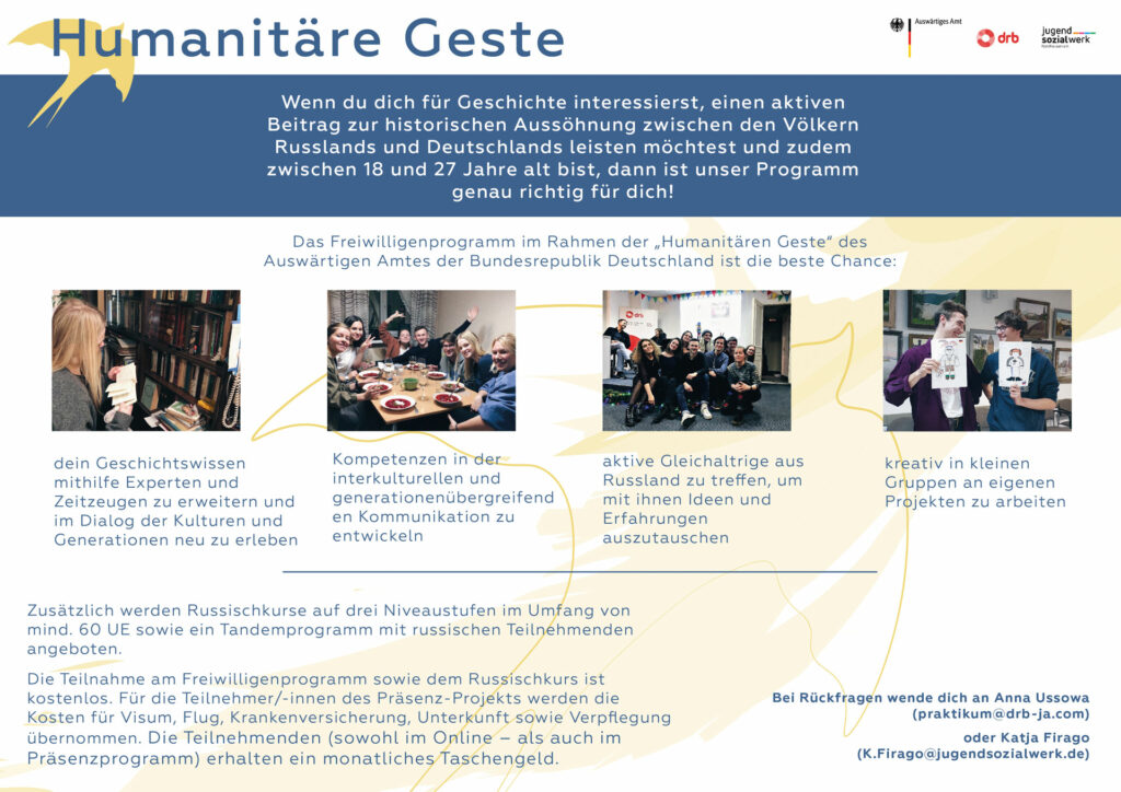 Falls du Fragen haben solltest, wende dich an die Projektkoordinatorin Anna Ussowa (praktikum@de.drb-ja.ru).