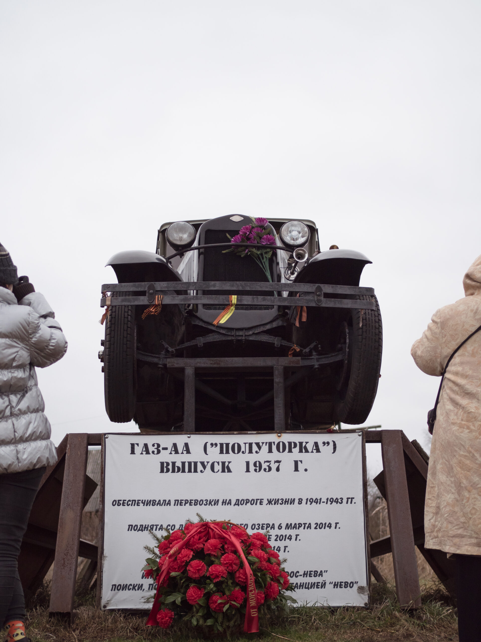 - Die „Polutorka“. Über diese Automobile vom Typ GAZ-AA haben wir bereits in einem früheren Artikel berichtet. Am Seeufer in Kobona steht eines der Denkmäler für die Anderthalbtonner. Das Auto wurde am 6. März 2014 vom Grund des Ladogasees geborgen. Die Bergungsarbeiten leitete S.W. Markow, Verwalter des Museums von Kobona und Chef der Unterwasser-Suchbrigade.